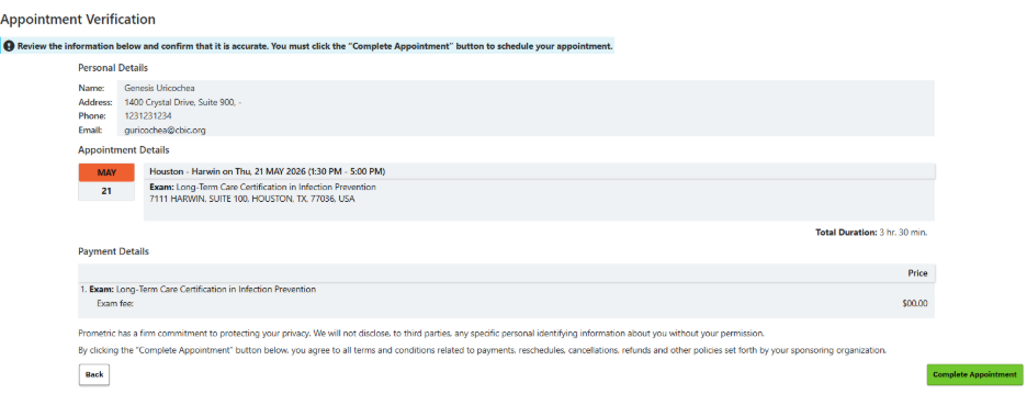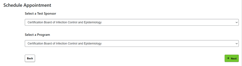 STEP 5: (Only applies to scheduling at Prometric Testing Center) Select Certification Board of Infection Control and Epidemiology for the Test Sponsor and Program.