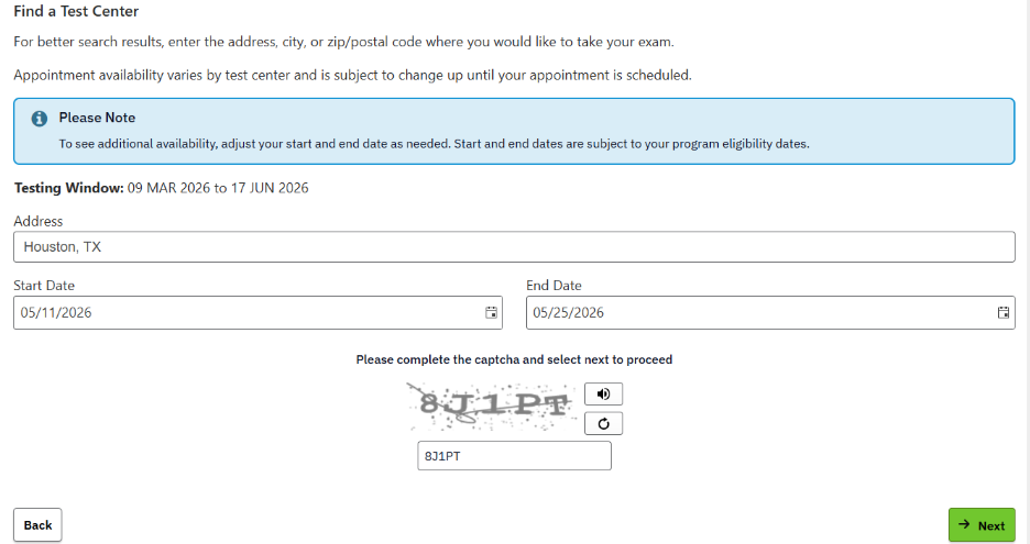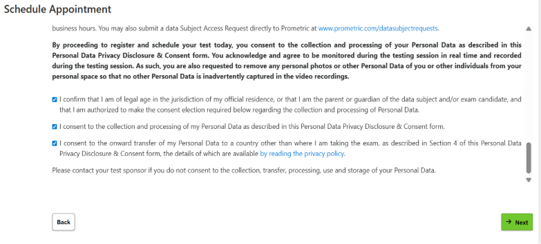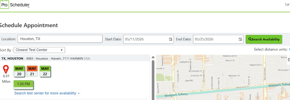 STEP 10: (Only applies to scheduling at Prometric Testing Centers) Select the location at which you’d like to test, then select your preferred date/time.