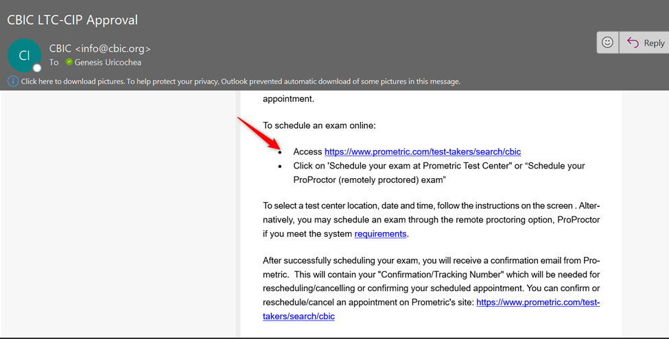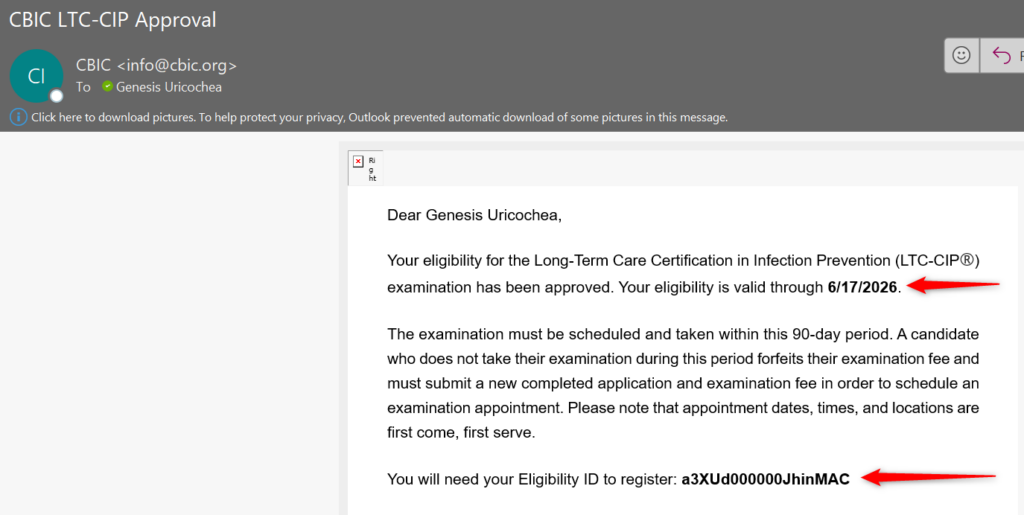 STEP 1: Review your CBIC approval email and locate your eligibility window and eligibility ID. In the sample email below, this candidate can schedule her exam through 6/17/2026 and her eligibility ID is: a3XUd000000JhinMAC.
