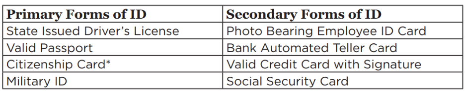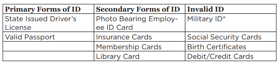 - Bring a secondary ID if your primary ID lacks a signature (Please refer to Acceptable IDs chart)